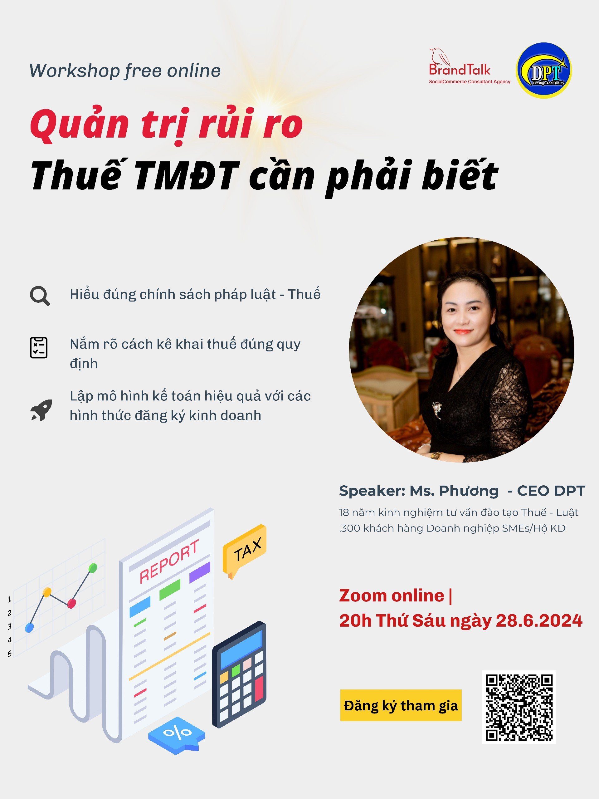 Quản trị rủi ro Thuế TMĐT do BrandTalk tổ chức MIỄN PHÍ với sự tham gia chia sẻ và giải đáp của chuyên gia tư vấn Thuế Võ Thị Hồng Phương - CEO Công ty tư vấn DPT sẽ giúp các ACE nhà bán hàng, Doanh nghiệp: