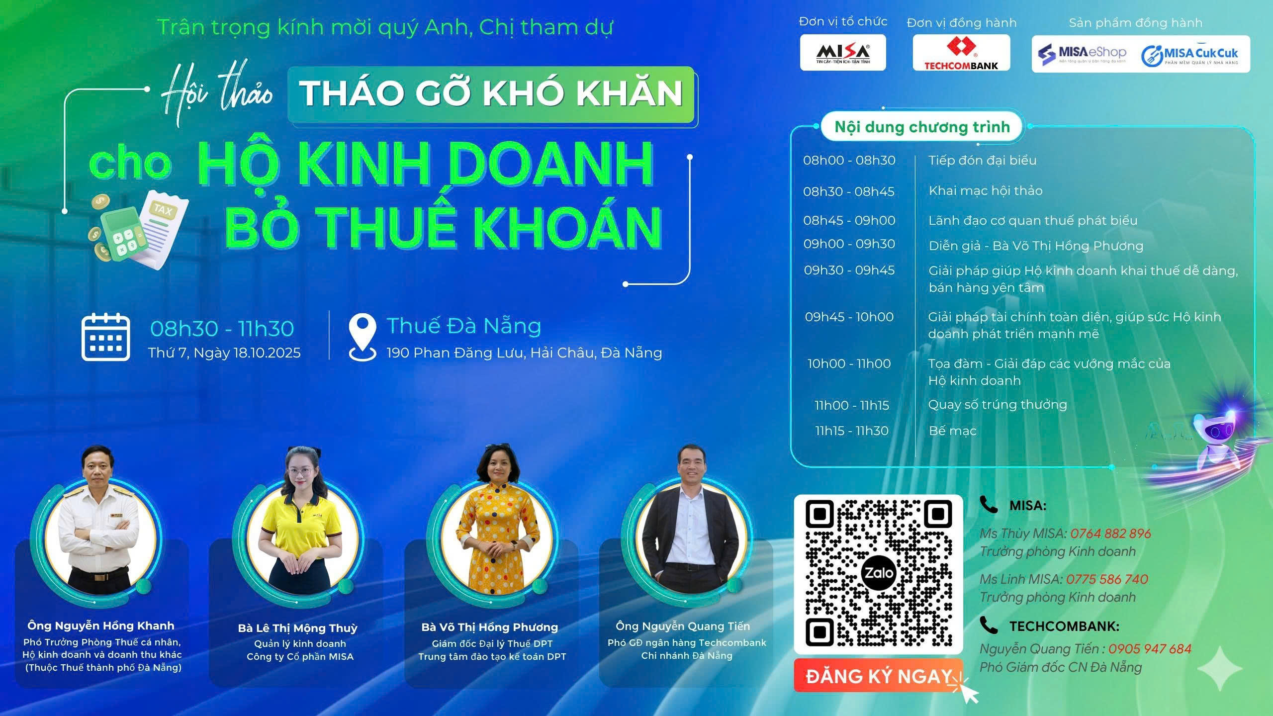 HỘI THẢO: THÁO GỠ KHÓ KHĂN CHO HỘ KINH DOANH BỎ THUẾ KHOÁN 📆 08h30 – 11h30 | Thứ Bảy, ngày 18/10/2025 📍 Thuế Đà Nẵng – 190 Phan Đăng Lưu, Hải Châu, Đà Nẵng